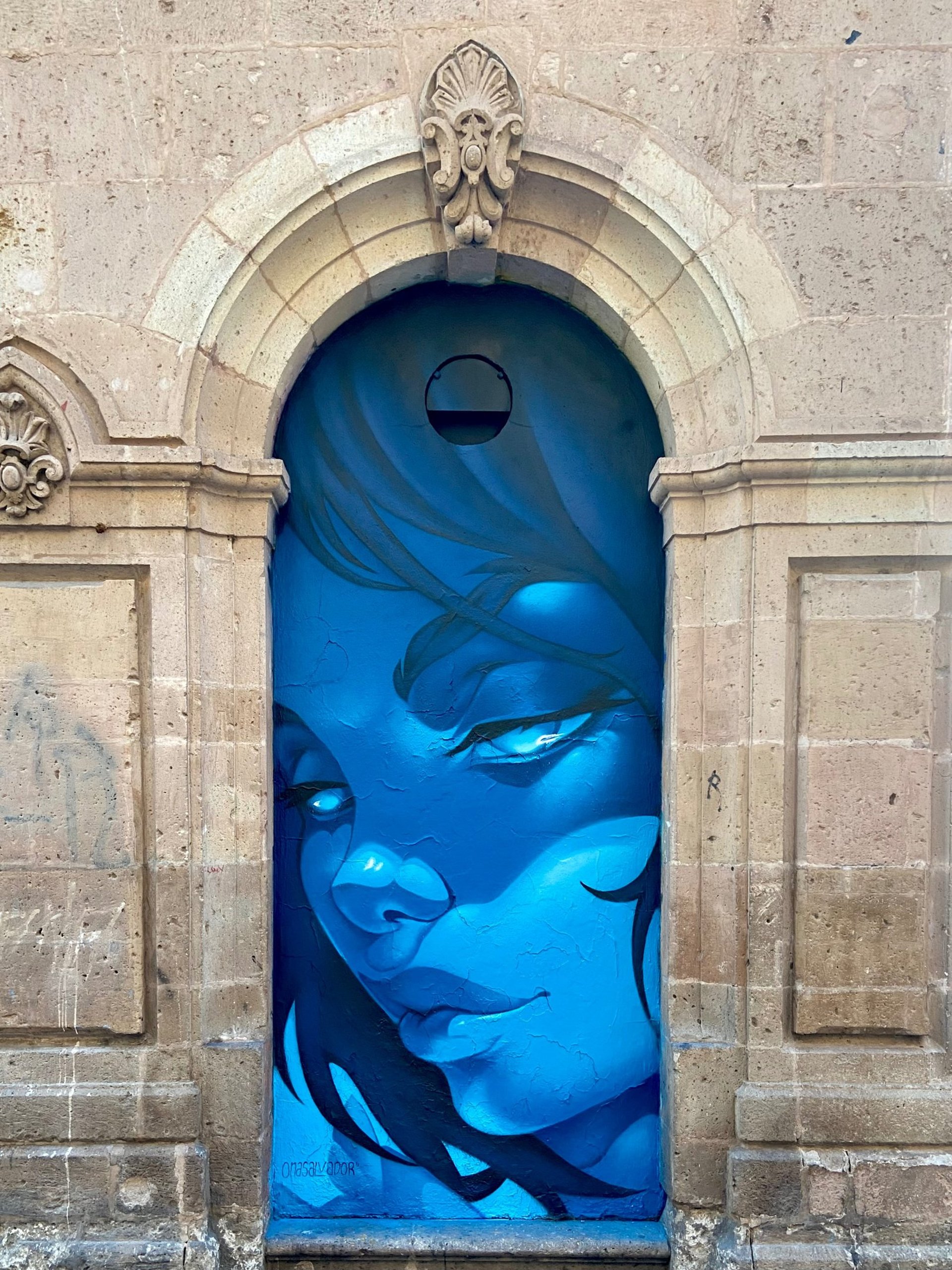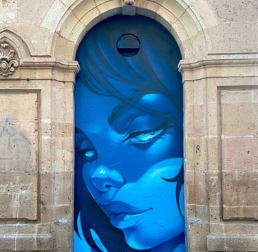Inspirado en la figura mitológica Calypso, símbolo de los umbrales entre mundos y la transición entre lo conocido y lo desconocido, este mural funciona como un portal que dialoga con la historia del lugar, integrando la tradición arquitectónica con la creación contemporánea.